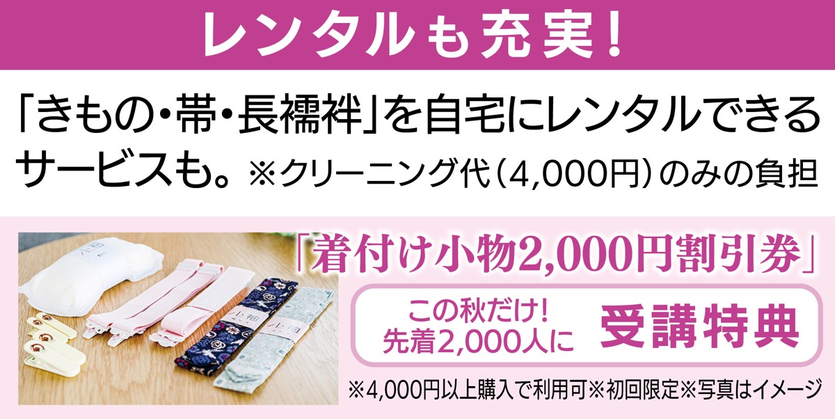 同社は今年で創業40周年を迎え、卒業生は21万人超を数える。毎年たくさんの人が、一人で「きもの」が着られるようになっている。「きものを着る人を増やして和装文化を守りたい」との想いから受講料は無料(一部自費の個人負担あり)。基本のカリキュラムは週1回2時間でレッスンはわずか6回。その後、継続することもできる(受講料はずっと無料)。さらに、通い放題のため補講や振り替えも可能だ。クラスは2〜5人の少人数制で、一人ひとりのペースに合わせた丁寧なレッスンなので、初心者でも安心だ。「早く、きれいに、簡単に」着られる「日本和装」だけの着付け方を身につけてみては。まずは問い合せを。