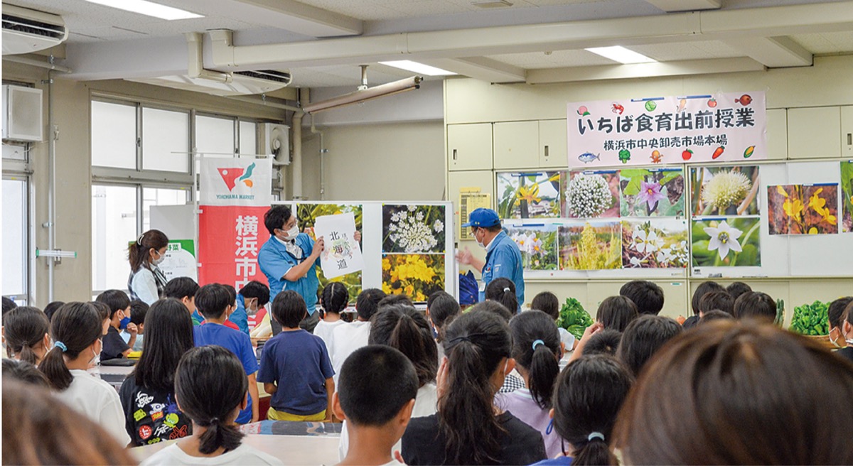 市場から新鮮な野菜や魚を持参して子ども達に見て触れてもらいながら学んでもらおうという出前授業。新型コロナウイルスの影響で近年は授業の実施を見合わせていたが、今年度から本格的に再開した。同小では総合的な学習の時間を使って農園活動を行い、近隣施設で販売していることもあり、今回は魚ではなく、野菜の出前授業となった。