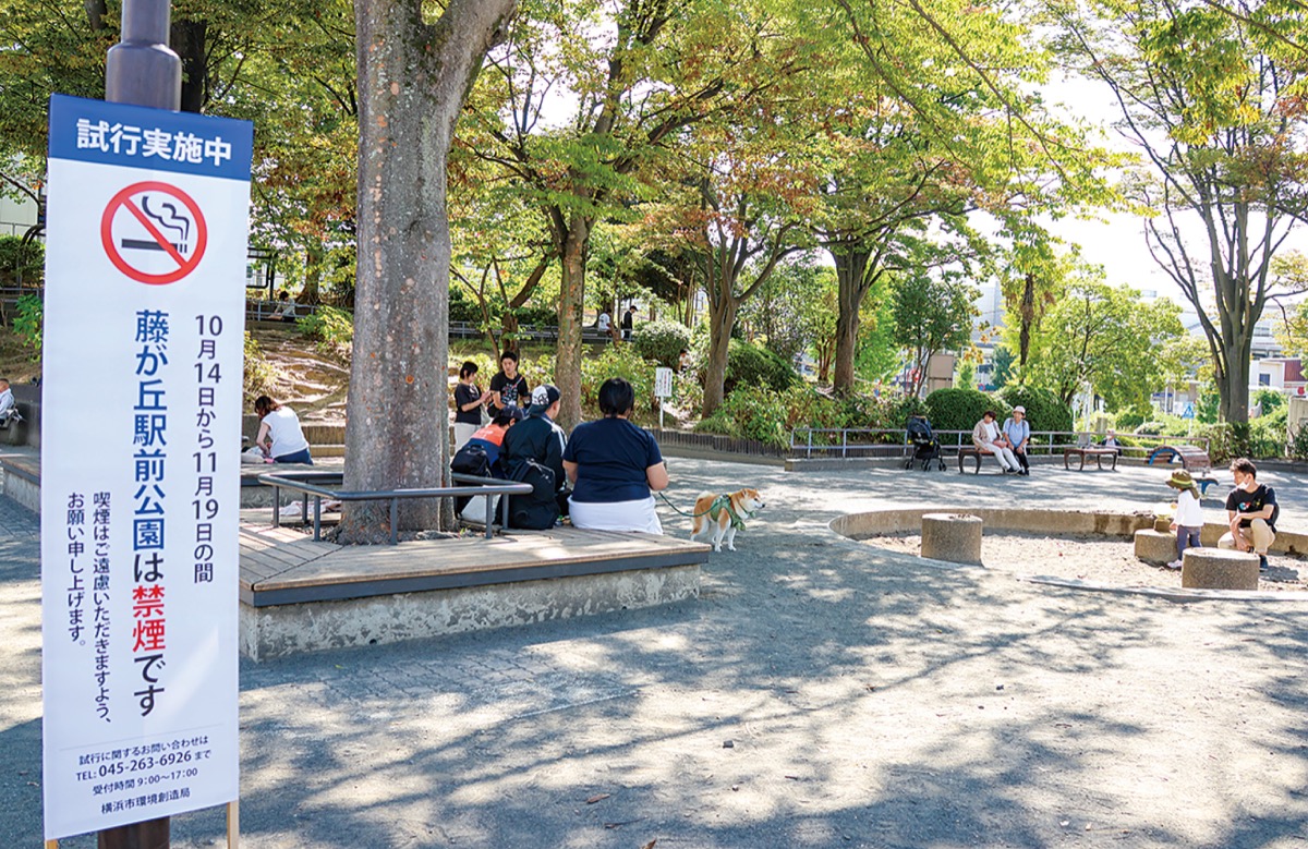 横浜市は受動喫煙対策として藤が丘駅前公園を含む市内5つの公園を試行的に禁煙とする取り組みを始めた。実施期間は10月14日から11月19日まで。市はアンケート調査を実施し、今年度中に公園内の受動喫煙対策について一定の方向性を取りまとめる方針だ。