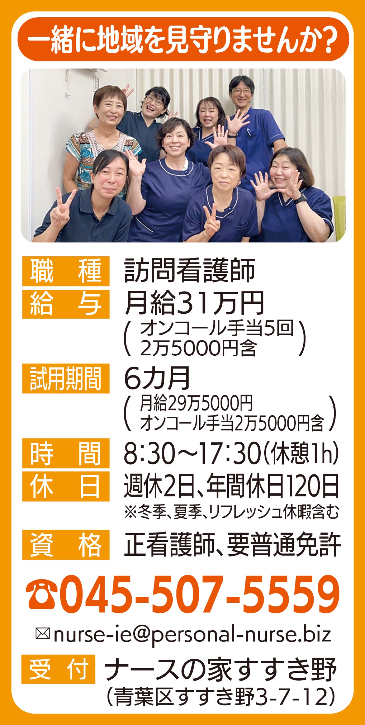 住み慣れた自宅や地域で、利用者の叶えたい生活の実現をサポート。「互いに学び合える環境がある職場です。訪問看護未経験でも可能。地域が好き、地域活動に興味がある方など一緒に訪問看護を学んでいきましょう」と担当者。左記の電話かメールにて応募。