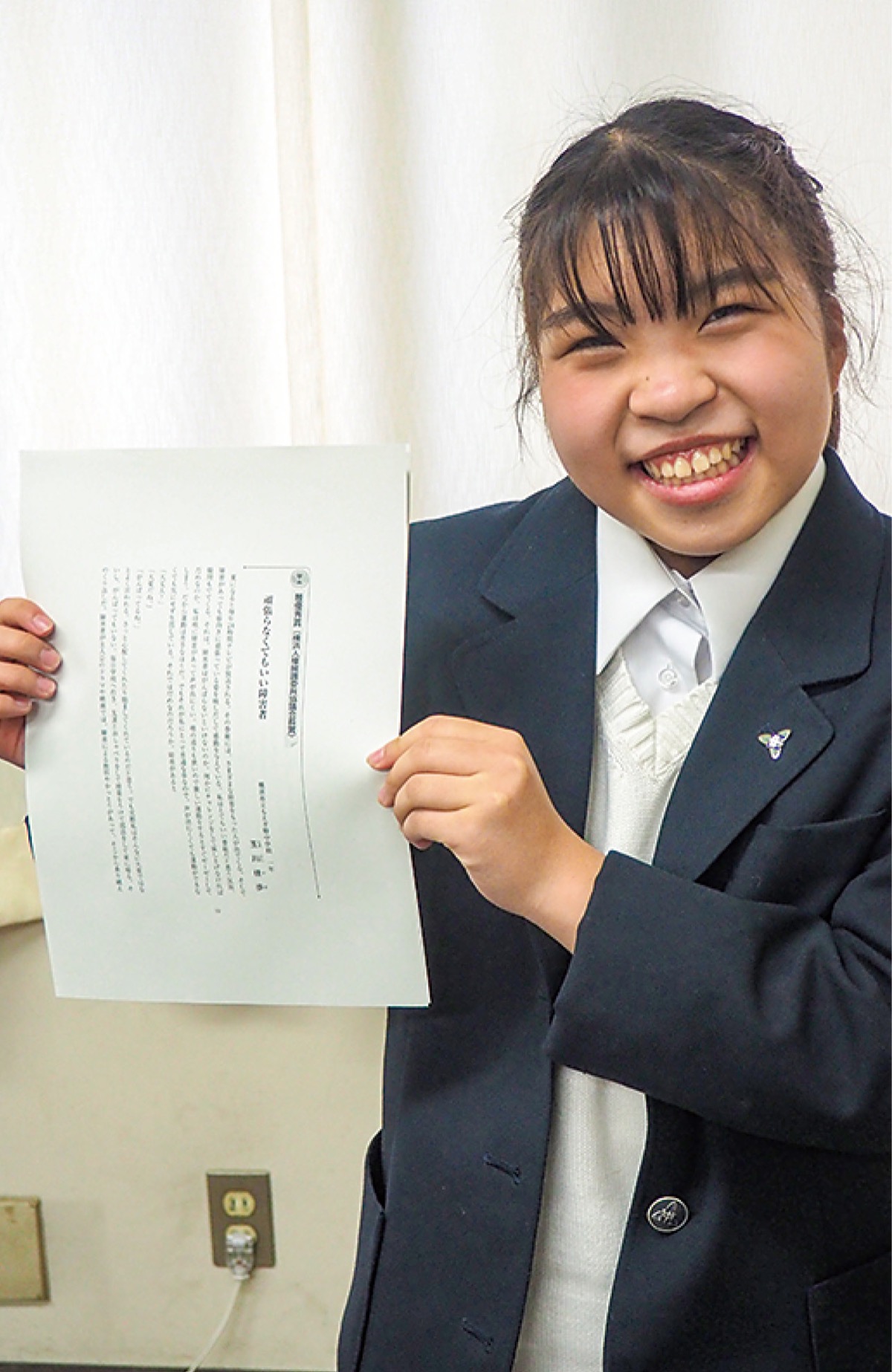 今回の作文では、テレビでの障害者の取り上げ方について感じた疑問を素直につづった。「障害イコール頑張る姿になっている気がする。障害に立ち向かうのではなく、障害と寄り添って生活していく。それが一般的ではないか」と問いかける。望むのは障害があるなしに関係なく、頑張らなくてもみんなが楽しく過ごせる世の中だ。