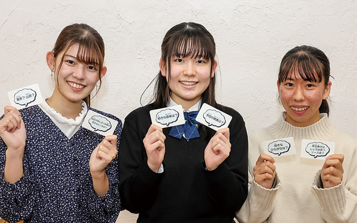昨年度に活動していた高校生4人、大学生4人による「ジェネレーションチーム」が「人と人をつなぐ時間を提供したい」と開発したもので、「人とつながりたい」と「タイム」を組み合わせて商品名としている。開発に関わった宮入香穂さん(大学2年)と高橋玲唯さん(高校3年)、長本吏央さん(同)=写真=は「何もない状態から一から考え、作り上げることは良い経験になった」「使い方を自由に考えてほしい」などと感想を話していた。同カードは同拠点で1000円(税込)で販売中。【電話】045・500・9254