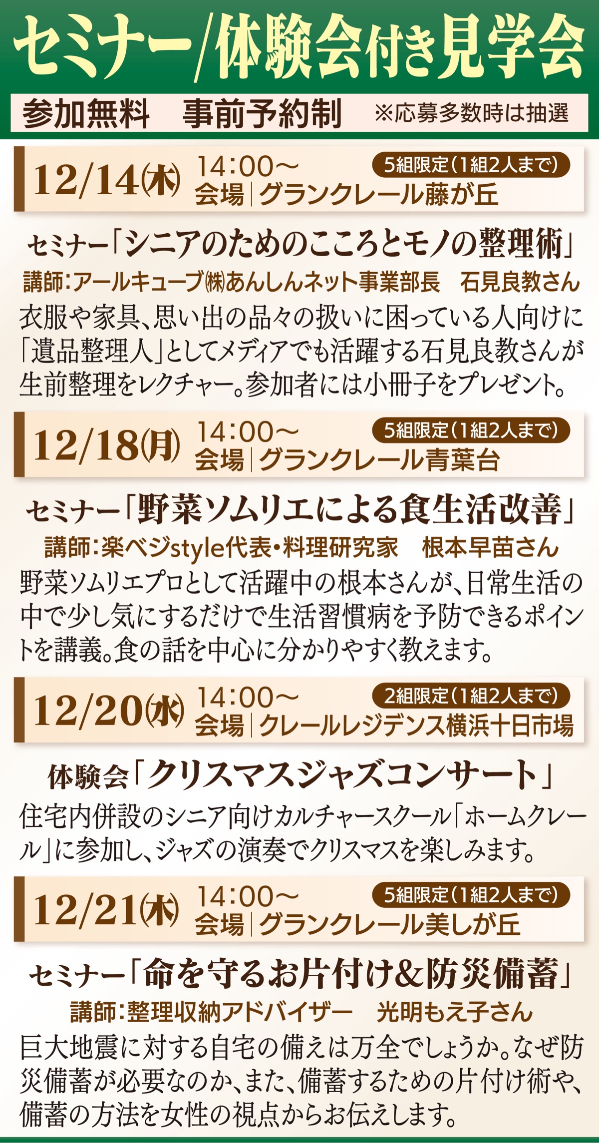 各住宅では日常に役立つ無料セミナーや、送迎車で2住宅を1日で巡る昼食付き見学会を行っているので、ぜひ気軽に参加して住宅ごとに異なる空気感も感じてみては。セミナーや見学会は事前申込制。日程と内容は別表参照。下記まで申込を。
