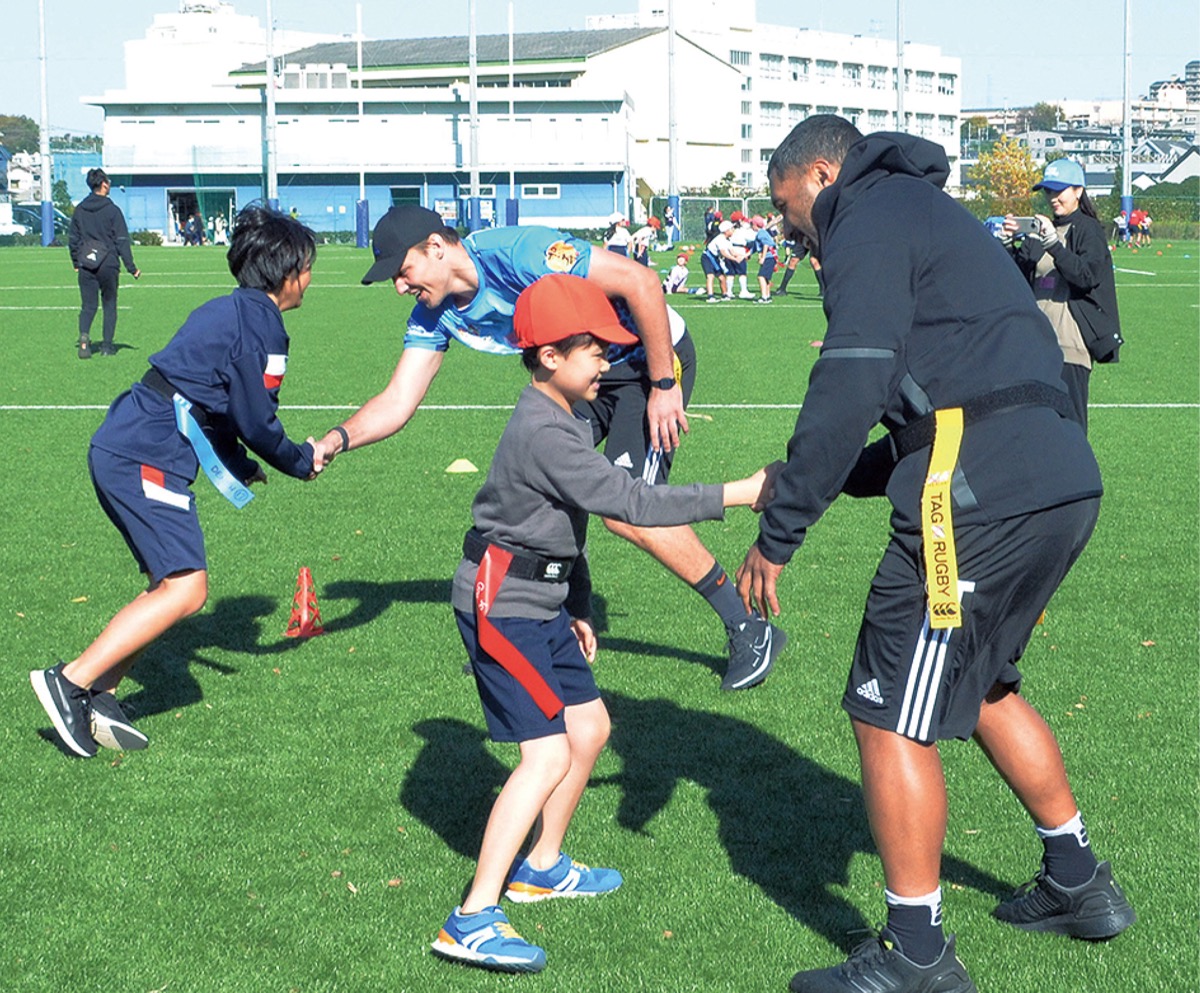 青葉区や都筑区を拠点に活動するNPO法人田園ラグビースクール(田園RS)が11月29日、荏田小学校3年生の体育の授業でタグラグビーを指導した。同校に隣接する清水建設荏田グラウンドで行われ、同所を練習拠点とする清水建設江東ブルーシャークス(江東BS)も協力。所属選手も授業をサポートした。