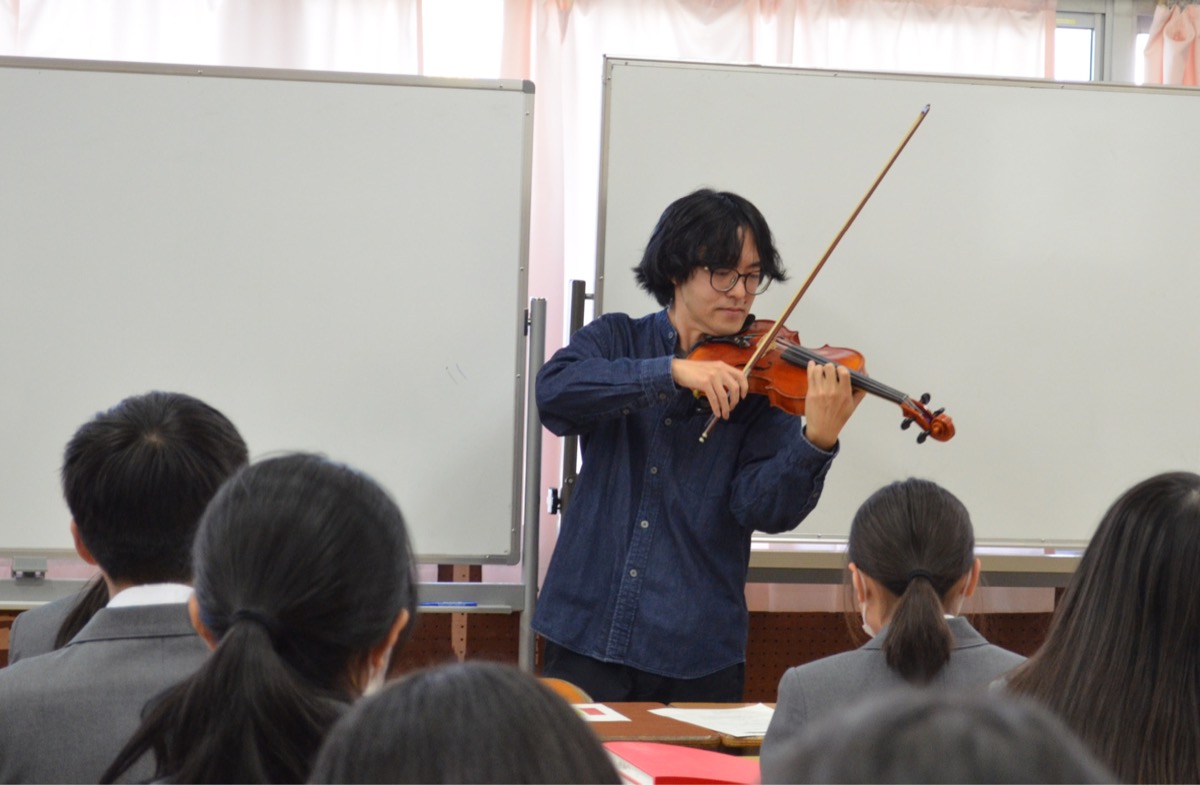 講師として初めて参加したバイオリン奏者の城所素雅さんは音楽家の目指し方や仕事の種類について紹介しながら、実際にバイオリン演奏を披露。生徒たちもバイオリン演奏を体験し「貴重な体験ができた。職業選択の1つとして考えていきたい」と話していた。
