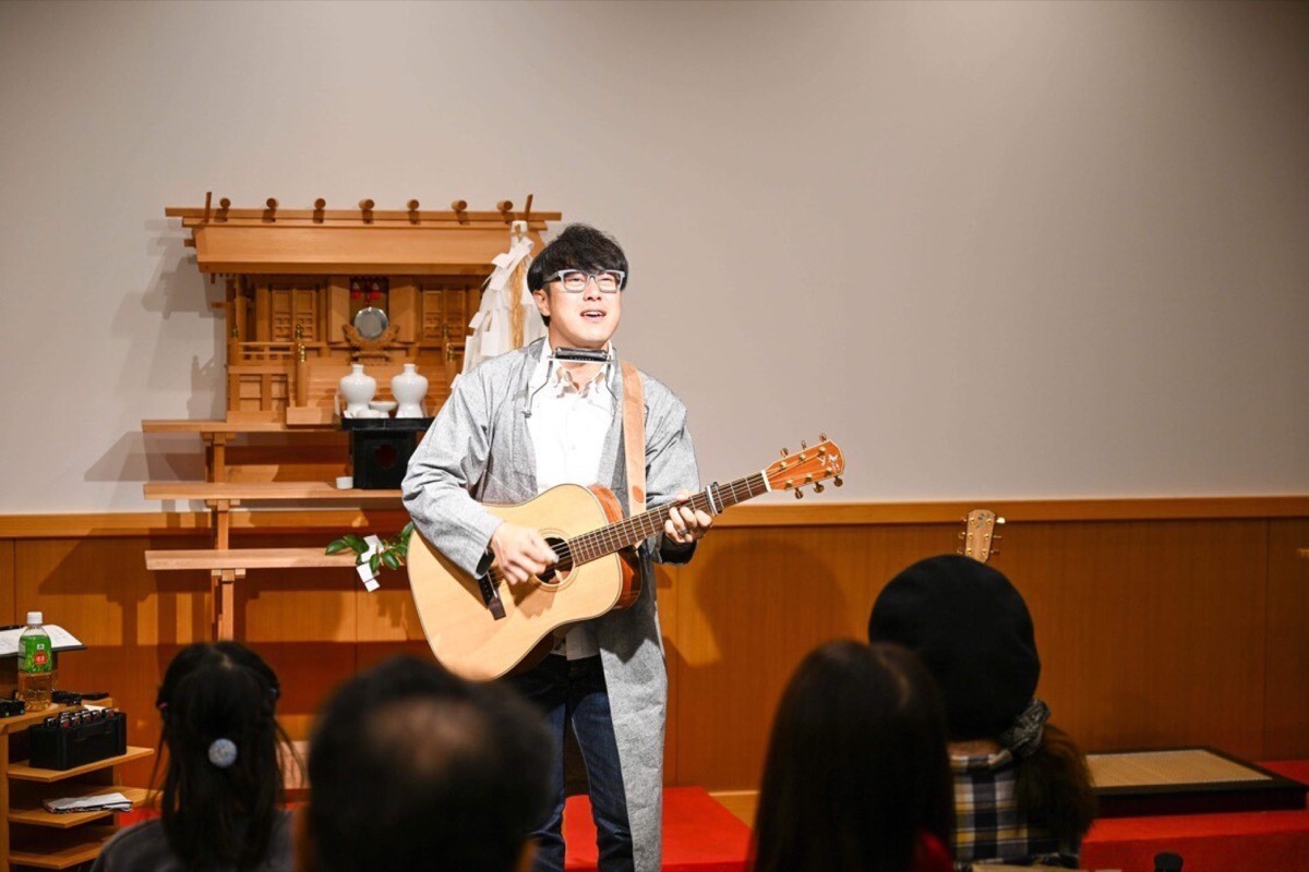 ミュージシャンだけではなく、全国1万社以上の神社を訪れている神社巡拝家で、神社ソムリエとしての顔を持つということもあり、ライブの会場は元々縁があった同神社に。各地の神社で数多くライブを実施している佐々木さんだが、青葉区内では今回が初めてだったという。当日は神職によるお祓いを受けた後に熱唱。最後は会場内で人気曲の「福風」を合唱し、幕を閉じた。