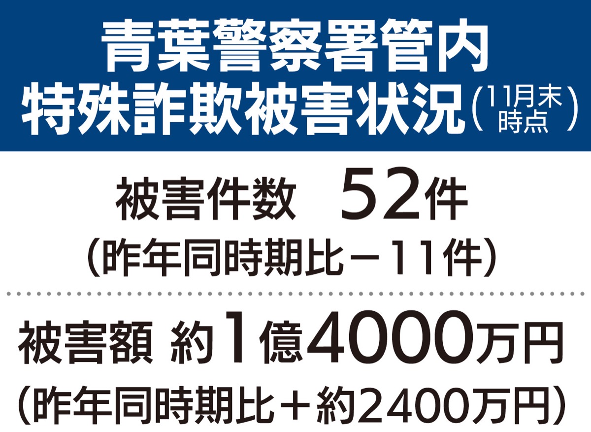 青葉警察署(橋谷田裕樹署長)によると、今年11月末までに同署管内で発生した特殊詐欺の被害件数は52件。昨年同時期と比べ11件減少しているが、被害額は約2400万円増加の約1億4000万円となっている。中でも還付金詐欺と呼ばれる手口が目立ち、その被害額は約9000万円に及んでいる。