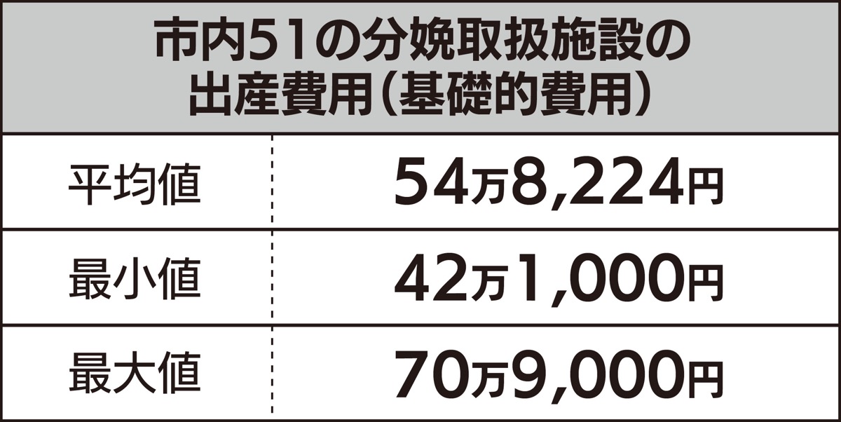 51施設の平均額は54万8224円となり、国が今年4月に42万円から50万円に引き上げた出産育児一時金では賄いきれていない現状が明らかになった。また、最も安価な施設が42万1000円だったのに対して最も高額な施設は70万9000円と、費用に大きな差があることも分かった。これに対して市の担当者は「県内でも都市部という点や各施設での分娩に対する考え方、経営費用の差なのではないか」と推測した。一方で、11の公的病院に限定すると約46万円から約58万円と費用の幅が小さかった。