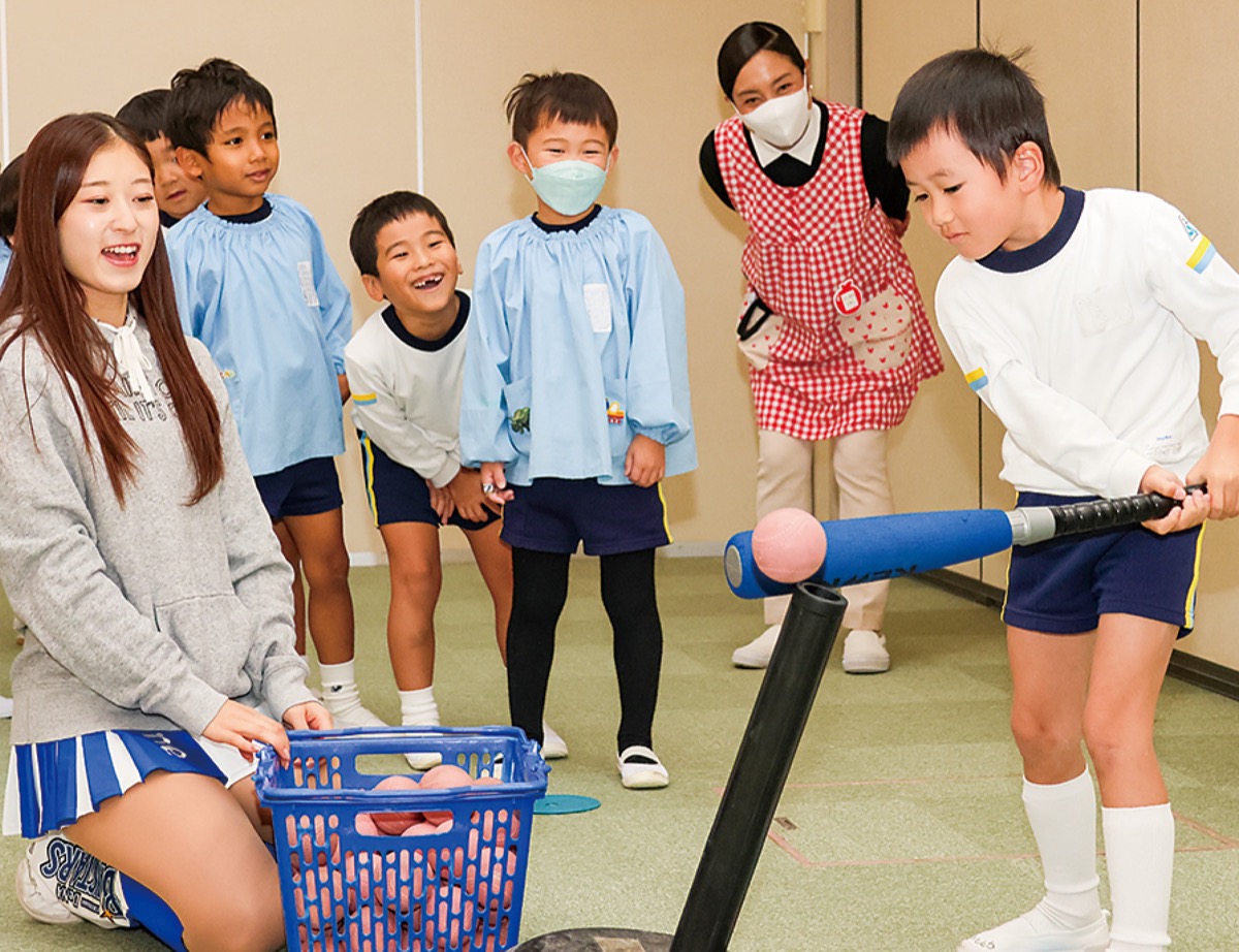 当日は雨天で、園舎内のホールでの開催だったが、元プロ野球選手の畠山(はたやま)準さんら球団スタッフ2人とオフィシャルパフォーマンスチーム「diana」のメンバー3人、マスコットのDB.スターマンが来園。柔らかいボールで「捕る・投げる・打つ」といったボール遊びを年長園児が体験した=写真。また、dianaメンバーとのダンスもあり、園児たちは楽しんでいた。
