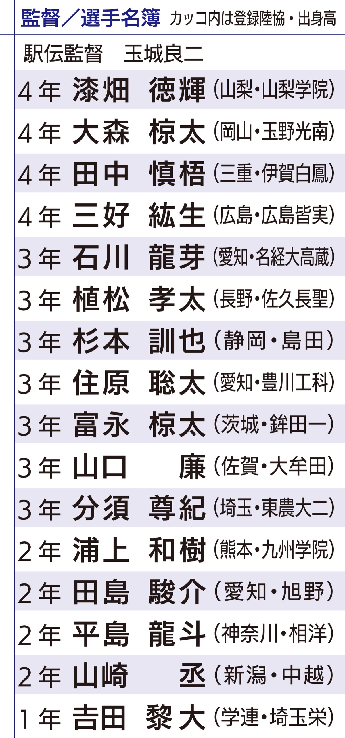 メンバーに選出されなかった4年生は10人以上いるが、玉城監督は「競技面や生活面でも、伝統をつなげることに対し、背中を見せてくれている」と4年生主体のチーム全員で戦う体制ができているという。往路は主力が並び、高速なレース展開が予想されるが玉城監督は「総合力は過去最高。10区までどんと構えてレースに臨みたい」と意気込む。