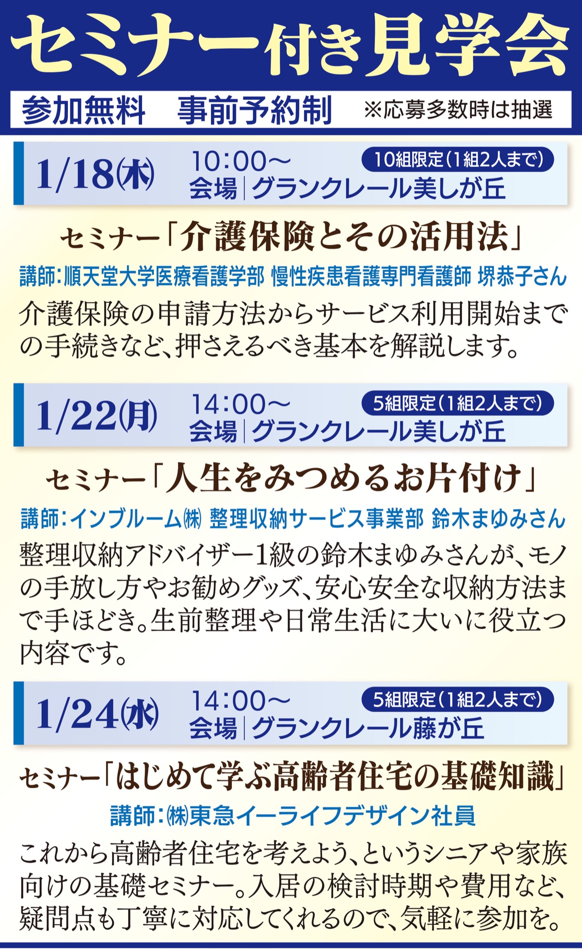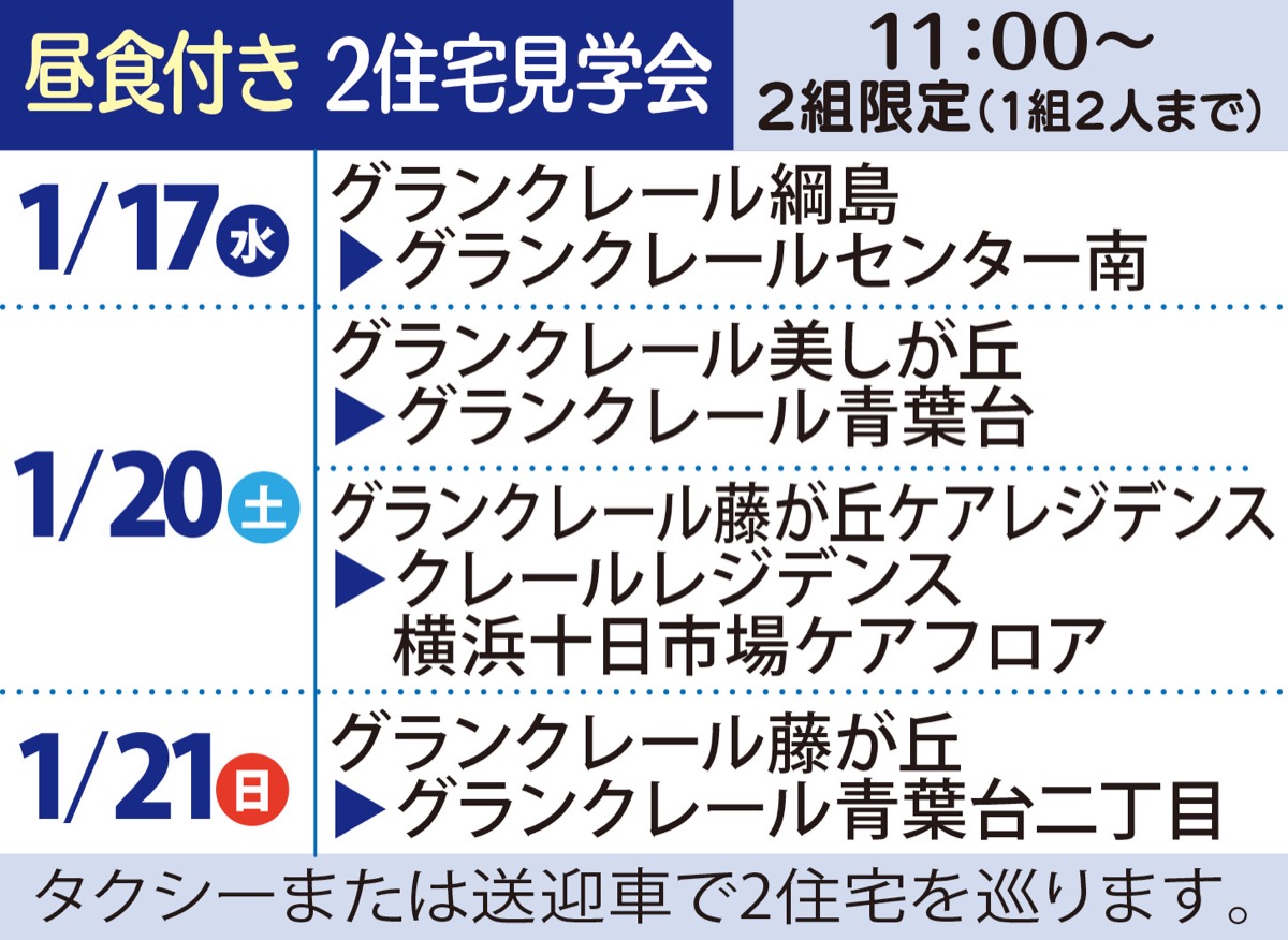 同シリーズ各住宅では日常に役立つ無料のセミナー(日程上表)を毎月開催中。2住宅を送迎車で1日で巡る昼食付き見学会(日程下表)も好評だ。いずれも気軽に参加を。事前申込制。申込は下記まで。