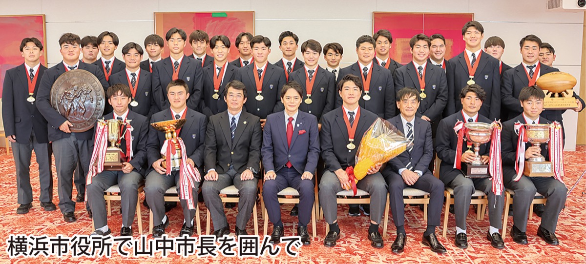 1月7日に花園ラグビー場で行われた決勝戦で、連覇を狙う東福岡を8対5で下し、3大会ぶり4回目の優勝に輝いた桐蔭学園。市役所と県庁を訪れた岡田直哉校長と藤原秀之監督、部員28人らは報告の後、それぞれ歓談も行った。山中市長は直近5年間で3回優勝という実績を踏まえ、「桐蔭学園ラグビー部がまさに黄金期を迎えている。横浜の高校が全国制覇するということは市民としてもこの上ない喜び」と賛辞を送った。また、黒岩知事は「頂点を極めたという自信は皆さんが生きていく人生の中で大いに役立つ」と部員に更なる活躍を期待した。一方、城(しろ)央祐主将は「自分は(第99回・第100回と)連覇して強い桐蔭学園に憧れて入学した。僕自身一人の力ではなく、みんなと優勝を掴むことができた」と喜びを語った。