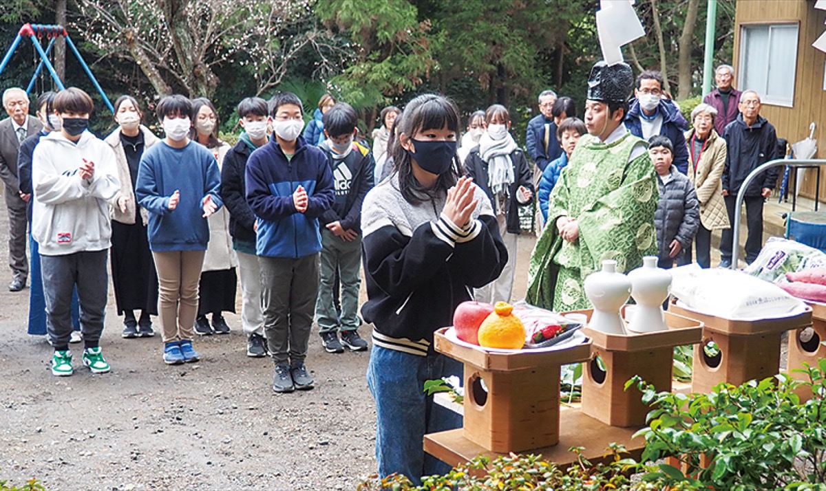 神事には鉄小学校の6年生25人も出席。児童代表者らが境内にある筆塚の石碑に榊(サカキ)を奉納し、感謝と祈りを捧げた。筆供養を終えた宮司は「菅原道真公は学問の神様。鉄小学校の皆さんの字が上手くなることと合わせて、学力の向上もお願いした。感謝の気持ちを忘れずこれからも勉学に励んでほしい」と呼び掛けた。