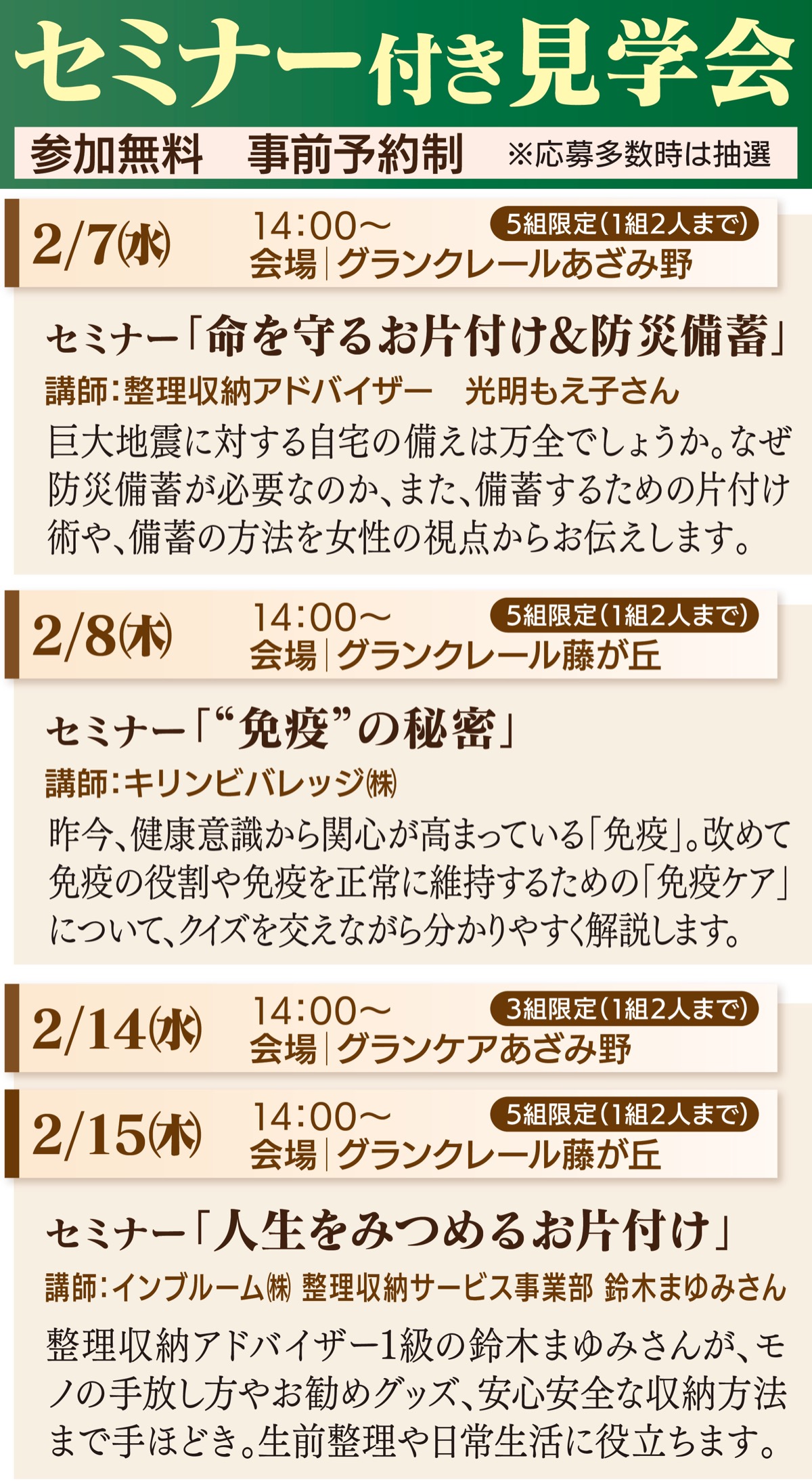 巨大地震に対する自宅の備えを学ぶ「命を守るお片付け&防災備蓄」などを予定。気になる免疫の話や生前整理など専門家の話を無料で聞ける機会だ。セミナー後は東急不動産HDグループが住まいづくりのノウハウを注ぎ込んだ質の高い住宅の見学を一緒にどうぞ。