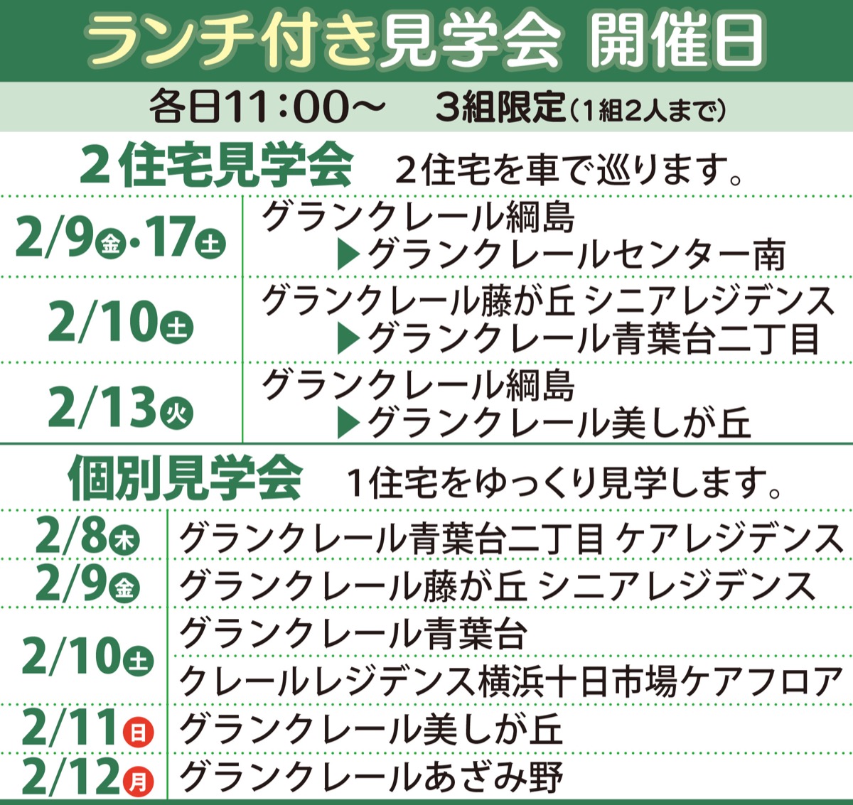 セミナー以外にも手作りで入居者と同じ食事を楽しめるランチ付き見学会も開催(日程下表)。そのほか、入居費用相談会も複数日時で実施中。すべて事前申込のため、下記まで連絡を。