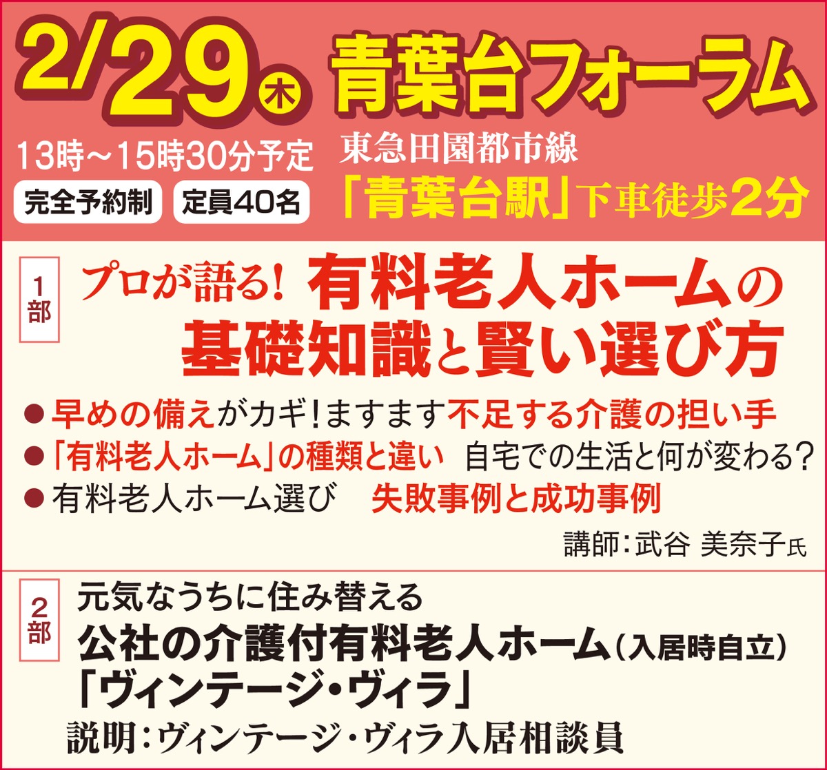 今回のセミナーでは、第1部でこれまで約2万件の相談を受けてきた、高齢期の住まい選びの専門家が「いつ頃から準備したらよいか」や「有料老人ホームの種類と違い」等を、実際の相談事例を交えながらわかりやすく解説する。第2部では、公社が事業主の「ヴィンテージ・ヴィラ(入居一時金2330・9万円〜)」が紹介される。