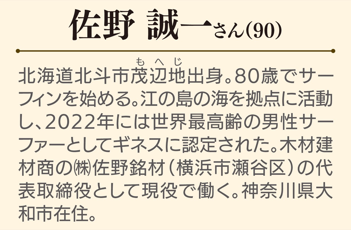 80歳でサーフィンを始め、世界最高齢の男性サーファーとしてギネスにも認定されている佐野誠一さん(90)。「『高齢だから』と諦めるのは好きじゃない。まだまだ、これから」と話す佐野さんに、人生100年時代を豊かに生きるヒントを聞いた。