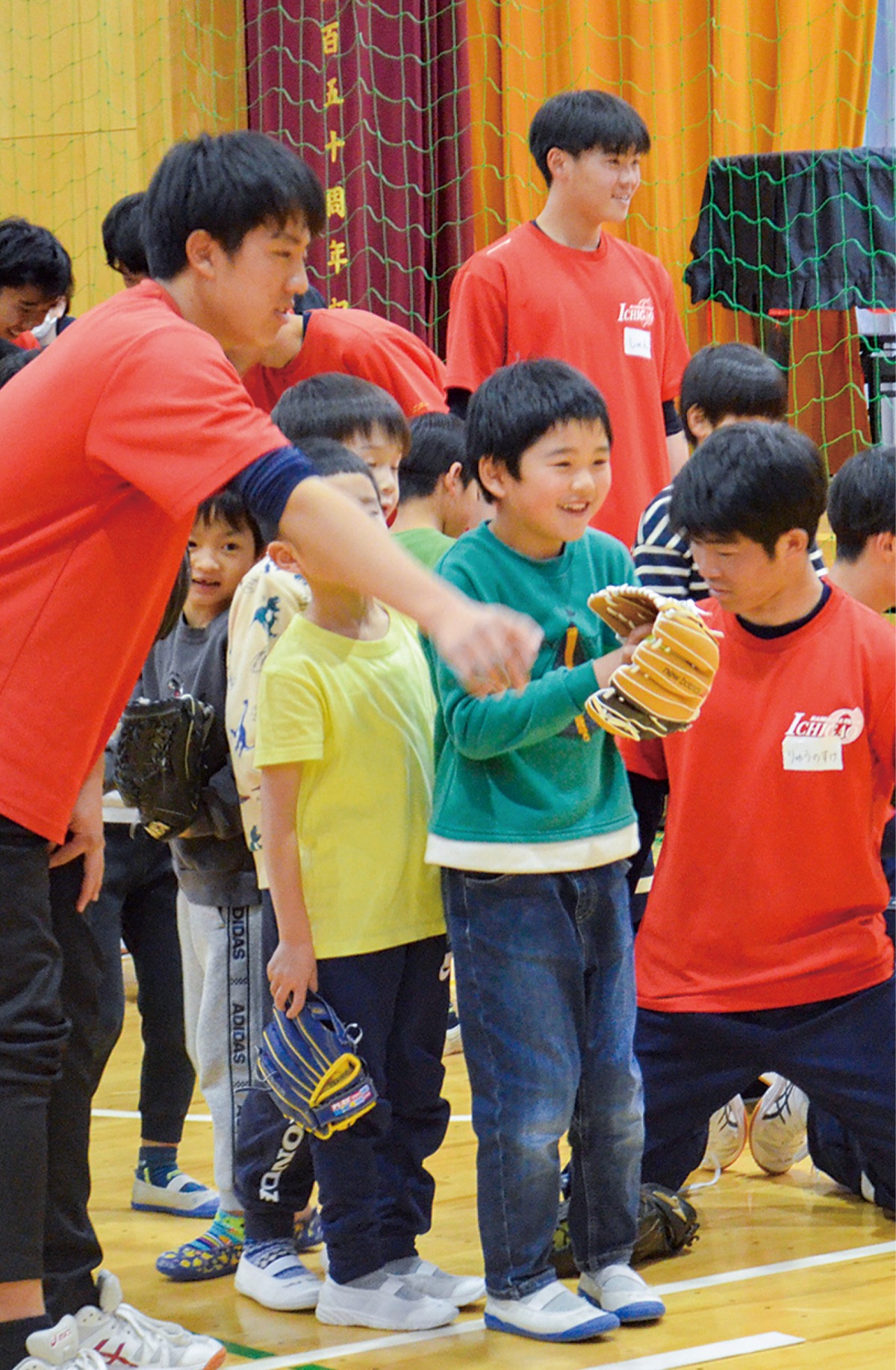 教室が行われた当日、あいにくの雨で体育館での開催となったが、部員40人とキッズクラブの低学年から高学年まで約50人の児童が参加した。部員と児童がペアになって準備体操を終え、キャッチボールからスタート。児童たちはボールの投げ方や捕球の仕方、構え方などを基本から学んだ。最初は争うように「大谷グローブ」を交代で使っていた児童たちも次第に興味はキャッチボールの方へ。部員たちに「上手い」「凄い」などと声を掛けられ、確実に上達していく児童たち。ストラックアウトやミニゲームのティーボールなどを1時間楽しみ、体育館は歓声を上げる児童の熱気に包まれていた。