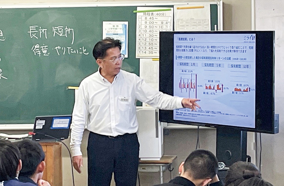授業では、生徒に将来のライフデザインを描いてもらい、そのためにどのくらい「お金」がかかるか考えてもらうことからスタート。住宅購入費や学費、老後の生活費などについても説明し、より現実的な計画の必要性を説いていた。青葉台支店の岩崎誠次長によれば、講師を務めた社員は2週間近く時間をかけて準備を行ったそうで、収入と支出の把握、貯蓄の大切さなどを分かりやすく伝えていた。また、株式や投資のリスクとリターンなどにも言及。マネープランとしての投資の実践には、分散投資と長期投資がコツであることなども訴えた。
