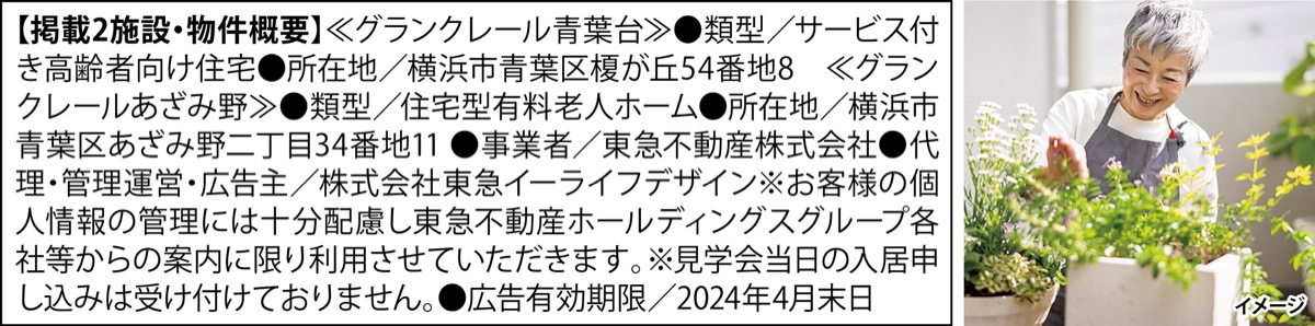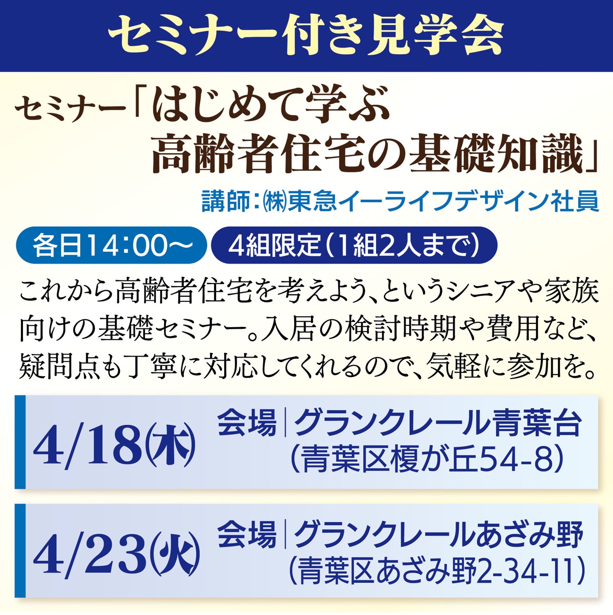 東急不動産HDグループが蓄積してきたノウハウを活かし、神奈川県・東京都で22住宅・約2030室を展開しているシニア向け住宅「グランクレール」シリーズ。青葉区内にあるグランクレール青葉台とグランクレールあざみ野の両住宅では4月に無料セミナー「はじめて学ぶ高齢者住宅の基礎知識」を開催する。