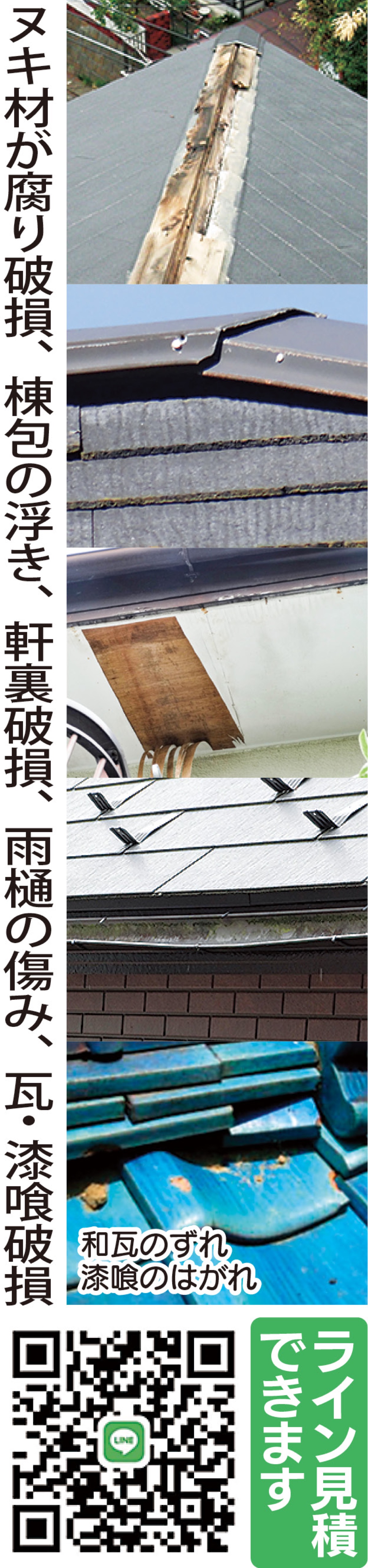 A.火災保険の「風水害補償」で可能に。手続きは▽相談▽下見▽家全体の点検▽申請書類作成&サポート(全て無料)。過去被害も3年前位まで対象なので相談を。保険給付時のみ工事するので実質0円です。また本紙掲載13年間トラブル無く安心を。営業員は居ないので材料と工事説明ができる現場担当者がご理解頂くまで説明。担当者が替わらない一貫体制です。