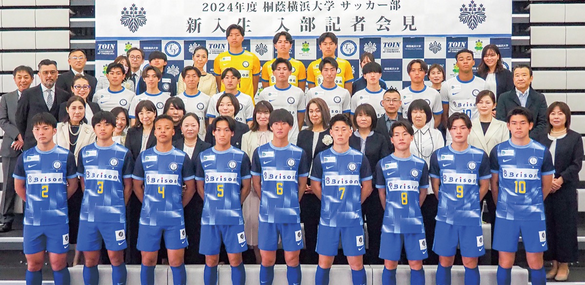 桐蔭横浜大学(鉄町/森朋子学長)で4月2日、サッカー部に加わる新入生の入部記者会見が初めて開催された。同日に行われる入学式を前に実施されたもので、日本高校選抜の一員として海外遠征中の太田隼剛選手(市立船橋高校)、杉本英誉選手(青森山田高校)を除く23人(学生スタッフ2人含む)とその保護者が参加した。