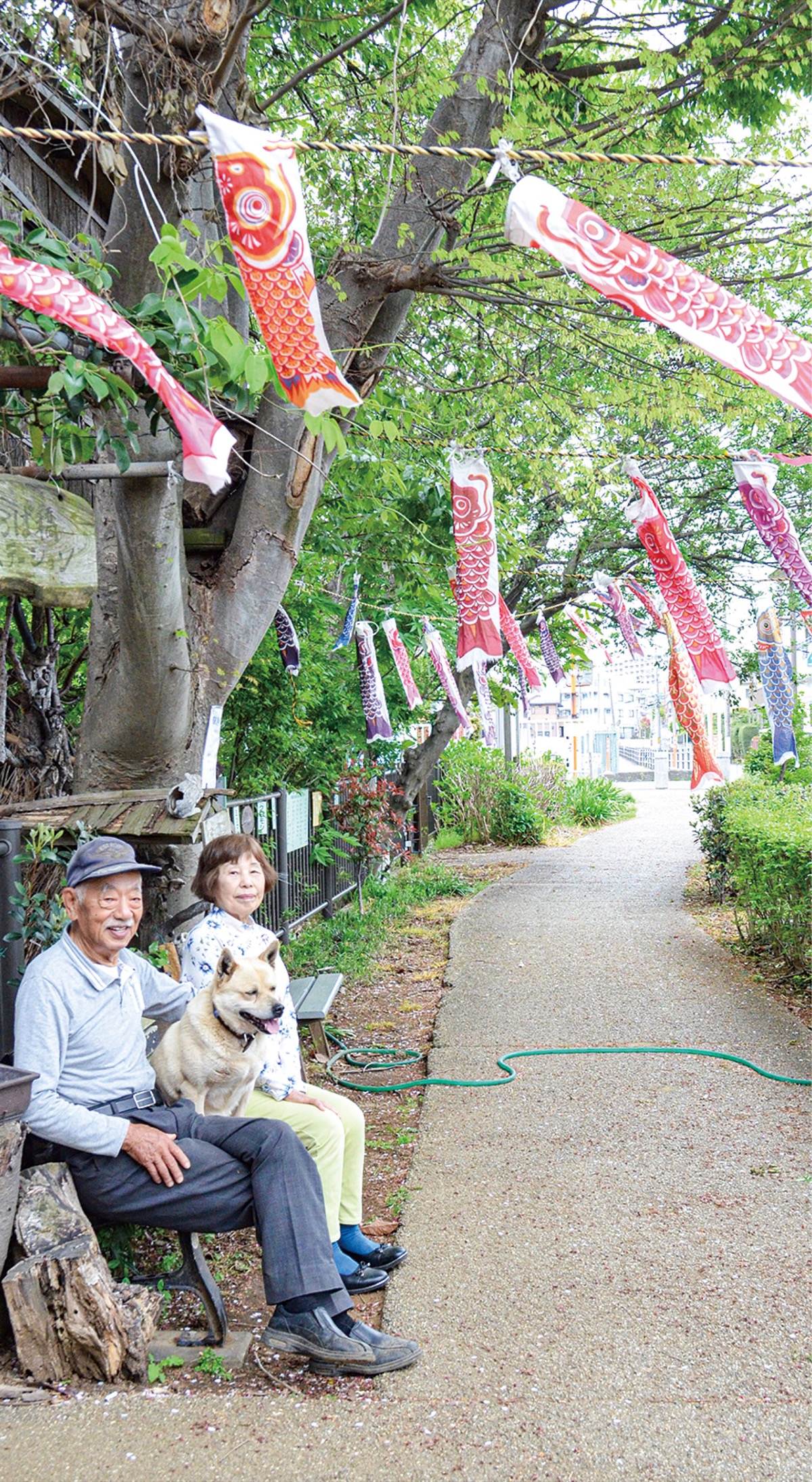 JA横浜中里支店付近の谷本せせらぎふれあいの道=下谷本町。この時期になると藤が丘在住の飯田喜好さん(丸栄精機(株)代表取締役/86)が地域住民に喜んでもらいたい一心で毎年こいのぼりを掲揚している。今年も色とりどりのこいのぼりが50匹ほど元気に風に揺られている。