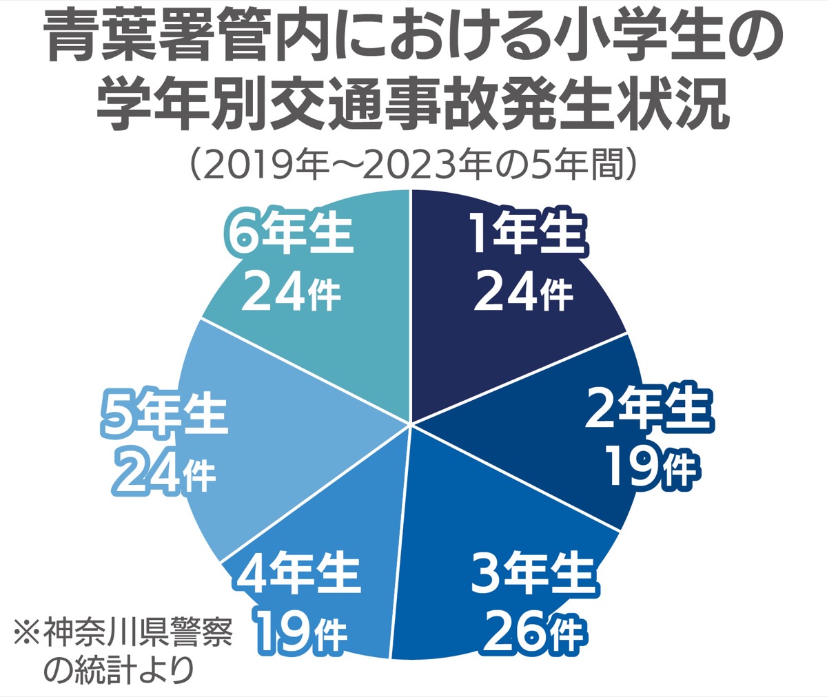 青葉署管内では、23年に小学生が関係する人身事故が21件発生している。学年別に見ると、1・2年生が共に5件、3年生が2件、4年生が1件、5年生が3件、6年生が5件となる。19年から23年までの累計でも、1年生から順に24件、19件、26件、19件、24件、24件と特に突出した差は出ていない。