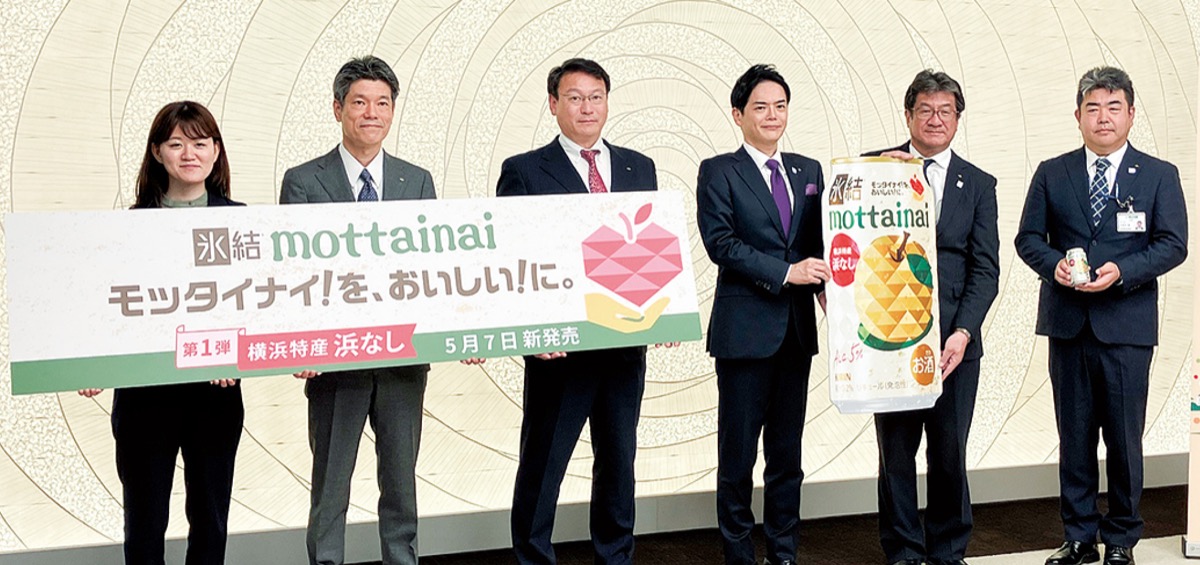 キリンビール(株)が規格外を理由に廃棄される果実を原料とした缶チューハイの新シリーズ「氷結 mottainai(モッタイナイ)」を発表し、第1弾として横浜のブランド梨「浜なし」を使用した新商品を5月7日に発売した。同日には関係者が山中竹春市長を表敬訪問し、商品をPRした。