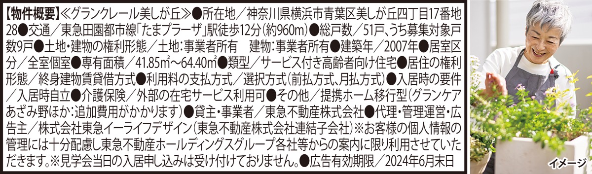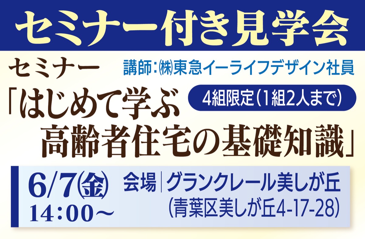 東急不動産HDグループのシニア向け住宅「グランクレール美しが丘」で6月7日(金)午後2時から、無料セミナー「はじめて学ぶ高齢者住宅の基礎知識」が開催される。