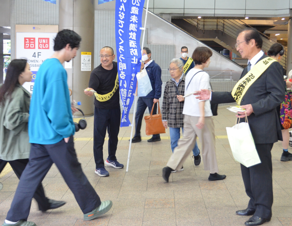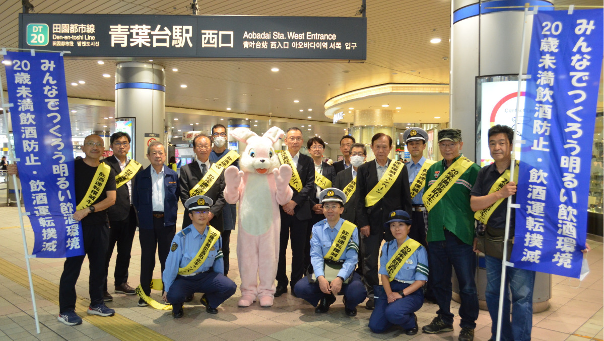 横浜小売酒販組合緑支部(小柳新一支部長)は5月20日、青葉台駅で「20歳未満飲酒防止・飲酒運転撲滅キャンペーン」を行った=写真上。