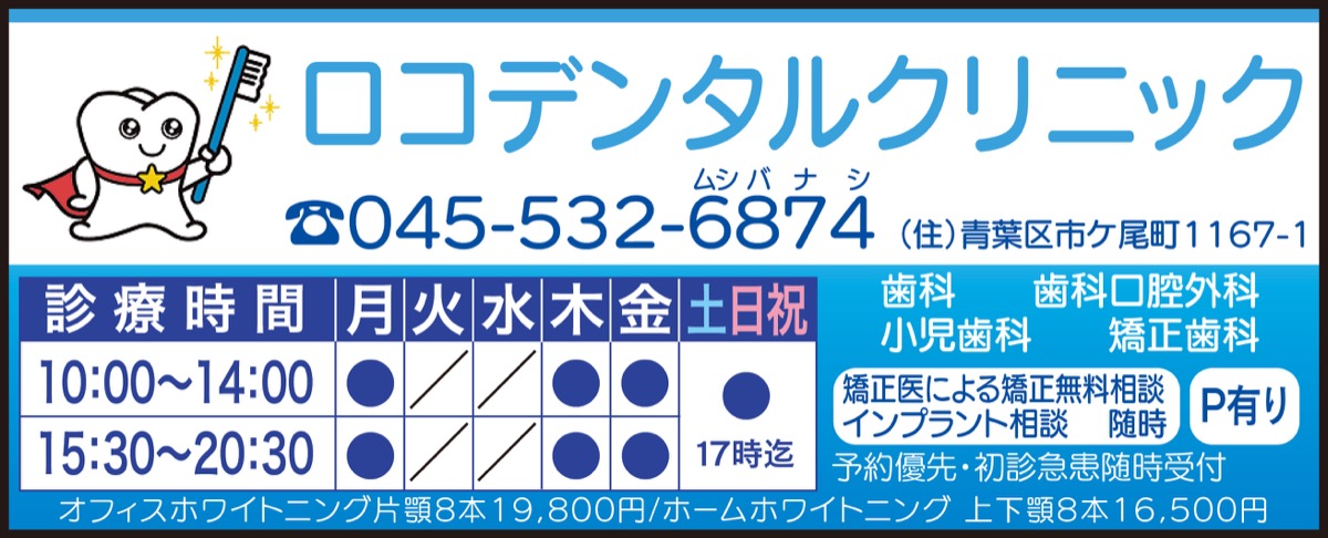 市が尾駅から徒歩3分の「ロコデンタルクリニック」は平日は午後8時半まで、土日祝も5時まで開院。地元青葉区に開院した田中院長が患者の利便性を第一に考えた地域密着の歯科医院だ。