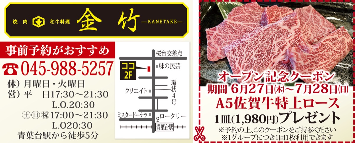 青葉台にこのほど、「焼肉和牛料理 金竹」がオープンした。同店は、あの「アッシェドールタケウチ」が業態変更したもので、美味しい肉をより気軽にとの思いが込められている。