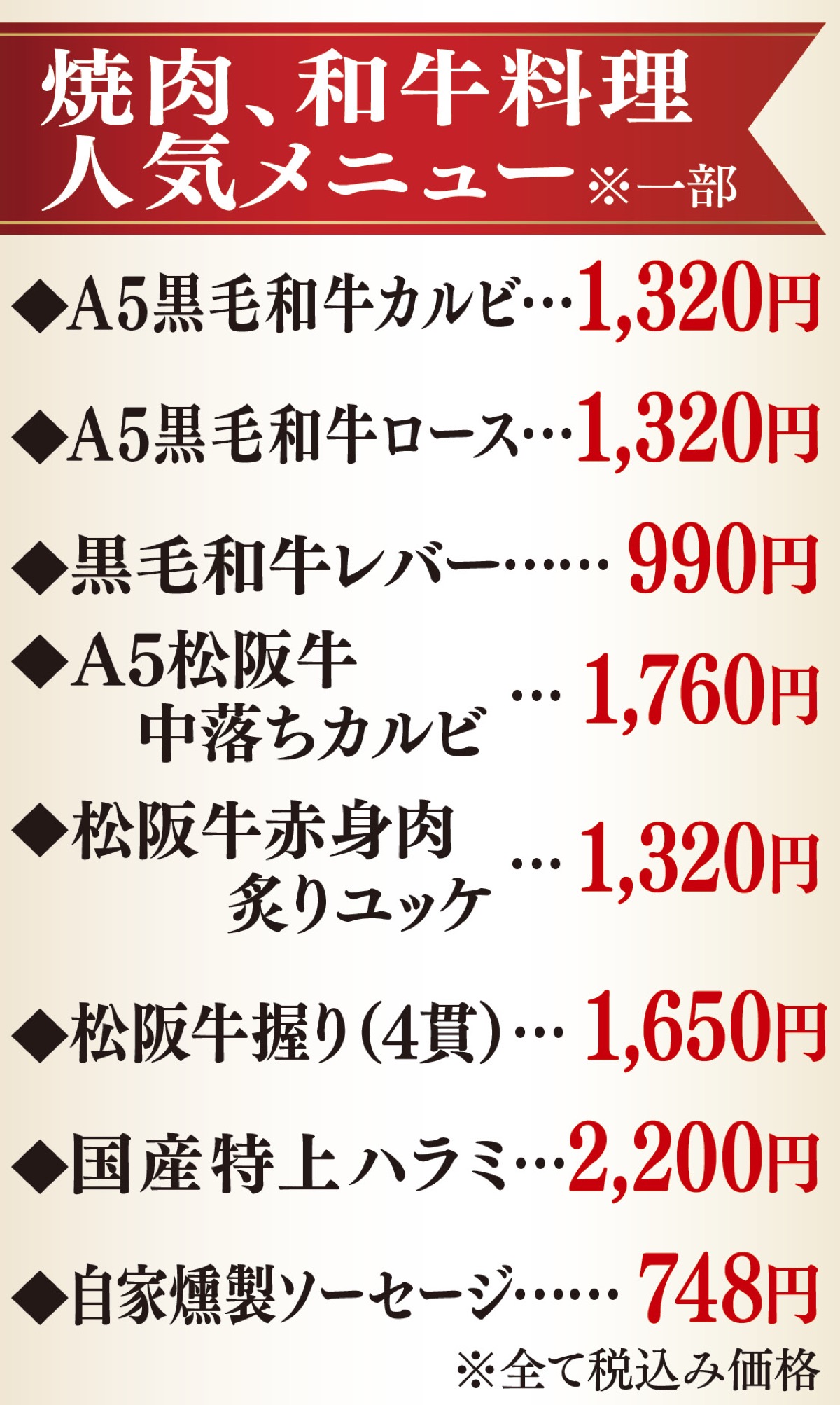 農家直送のA5ランク松阪牛や全国から選び抜いた黒毛和牛のほか店名の通り一品料理も充実。通常この価格では味わえないという松阪牛の極上サーロインや佐賀牛のレバー、松阪牛のユッケや煮込みなど、上質な肉をさまざまなアプローチで。ロースターの網も熱伝導にこだわり、旨味を閉じ込めた「一味違う焼肉」を堪能できる。