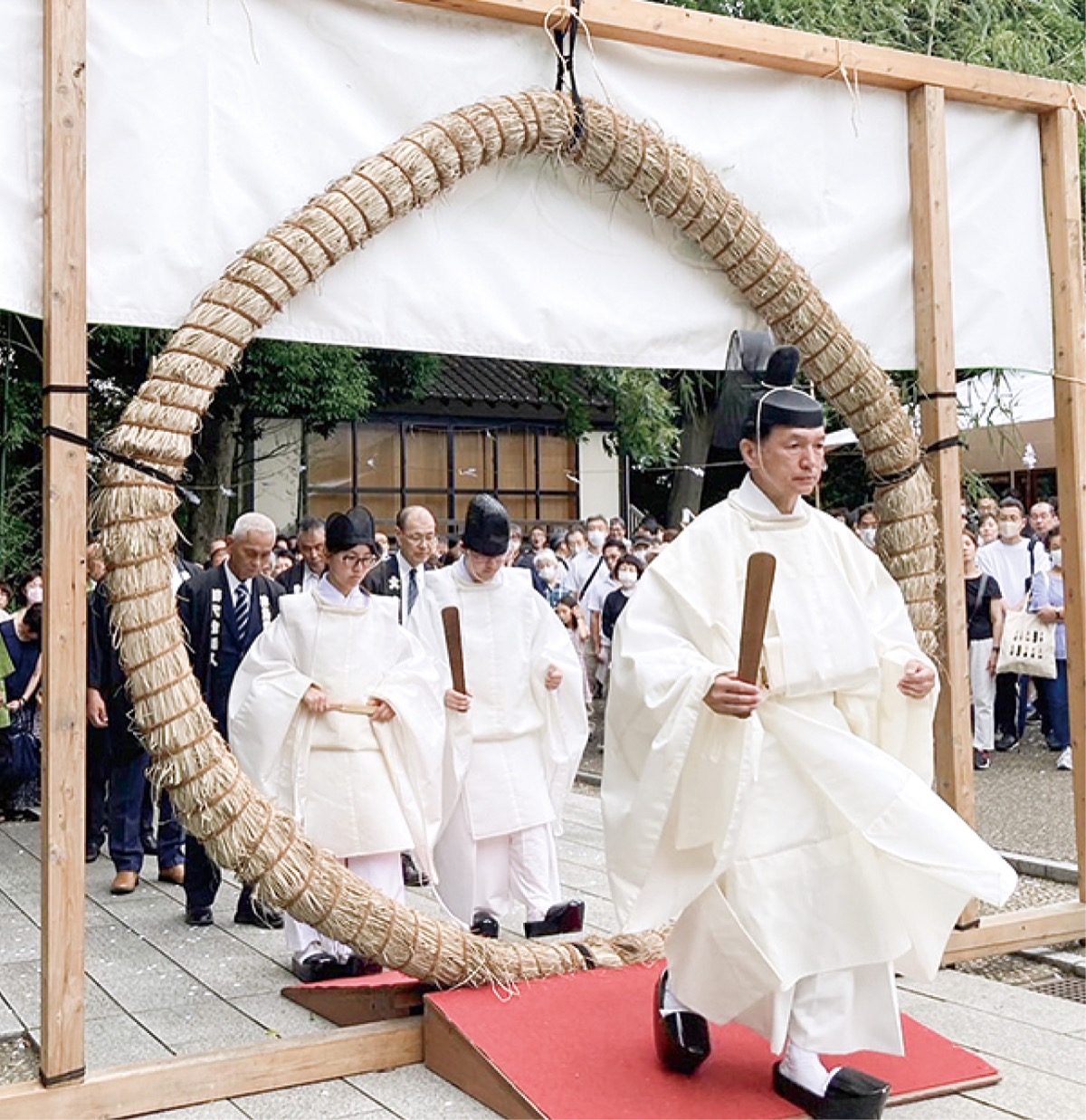 大祓式とは半年の生活の中で知らない内に犯した罪や心身の穢れを人形(ひとがた)に移し祓い清めた後、直径3mの「大茅(ち)の輪(わ)」を8の字を描くようにくぐる神道儀礼だ=写真。