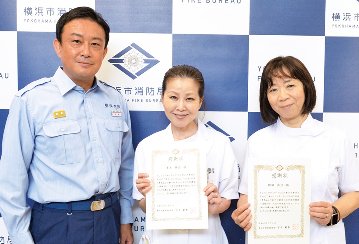青葉消防署(宇多範泰署長)は荏田町で発生した火災に迅速な通報と適切な初期消火をしたとして7月4日、敷地内にあるフィットケア・デポ荏田246店の従業員2人に感謝状を贈呈した。