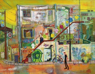 下北沢には10年以上通っている山田さん。「異国の雑貨屋に老舗カフェ、楽器を背負った若者、地元のお年寄りと、文化や生活が入り混じった雑多な感じがすてき」と話す。大賞を受賞した『古着屋』は、レトロな古着屋の建物にインスピレーションを受け、色合いやタッチなど「はじけた感じ」で路地の雰囲気を表現した作品。「大きな作品だから、全体のリズムが単調にならないよう意識した」という。