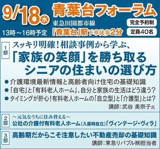 そこで今回のセミナーでは、元気なうちから検討すべく、1部では相談実績豊富な講師が有料老人ホームの賢い選び方や住み替えを失敗しないためのホーム見学のコツを解説。2部では公社が事業主の「ヴィンテージ・ヴィラ(入居一時金2449万円〜)」も紹介。また3部では、東急リバブル(株)の担当者が、青葉台周辺の不動産市場や売却時に知っておきたい基礎知識を伝授。所有不動産の売却と住み替えを検討している方はぜひご参加を。
