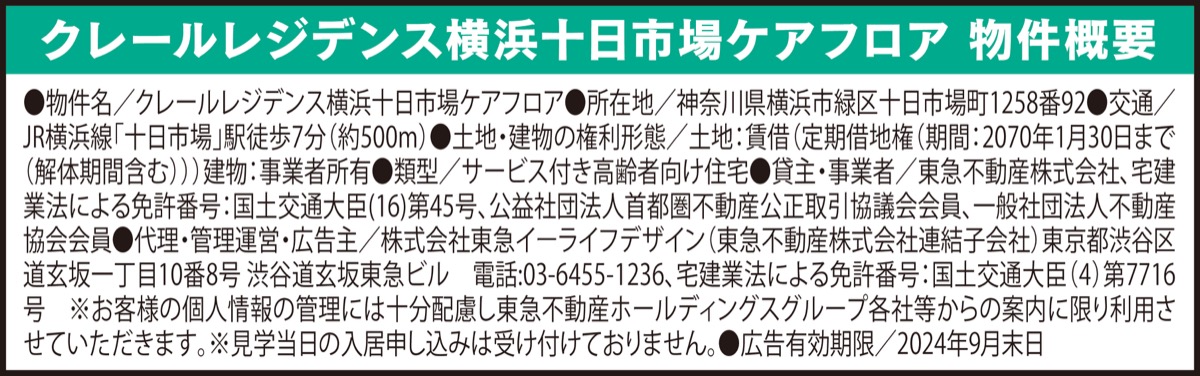 東急不動産HDグループ運営 「クレールレジデンス横浜十日市場ケアフロア」 要介護者向け介護住宅
