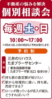 新年度からの新生活に合わせ、住み替えや自宅の売却依頼が増えるこの時期。たまプラーザ駅徒歩3分の三井のリハウスたまプラーザセンターでは、不動産の困りごとに関する無料相談会を開催する。日時は毎週土・日で、9月は16、23日の祝日も実施する。