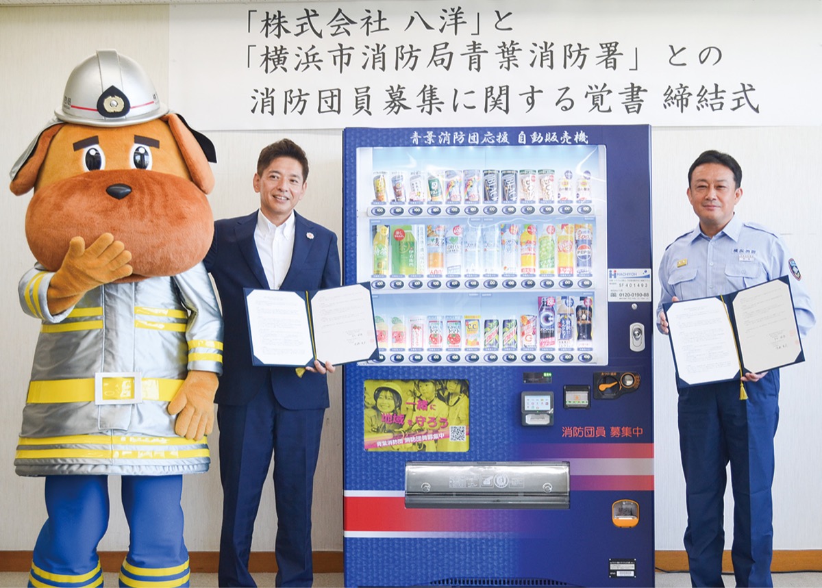 青葉消防署(宇多範泰署長)は9月2日、自動販売機事業を展開している(株)八洋(後藤晃宏代表取締役社長/東京都)と「自動販売機を活用した消防団員募集広報」に関する覚書を交わした。