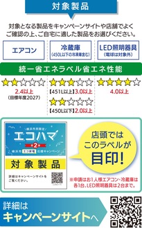 横浜市は家計の負担軽減や二酸化炭素排出量の削減を目的に、節電効果の大きい家電の本体購入価格の20%(上限3万円)分をポイント還元するキャンペーン「エコハマ第2弾」を6月6日から実施している。申請期限は12月26日だが、予算上限に達し次第早期終了し、最終日の申請は抽選での還元となる場合がある。市内の対象店舗でのキャンペーン期間内の購入が条件で地域に根差した「街のでんき店」も多く対象となっている。