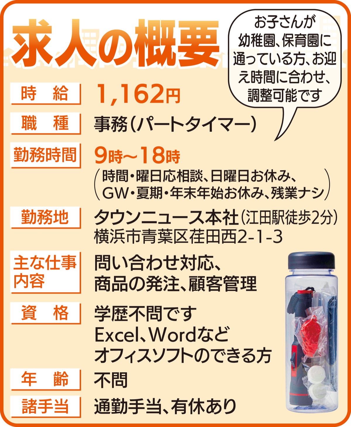 業務は、企業のプロモーションにまつわるグッズ制作や防災グッズの企画・販売です。特に防災グッズについては、ゲリラ豪雨や地震など、頻発する自然災害への備えとして地域からも非常に高い関心があり、販売を通じて地域の皆様に安心を届けることが仕事です。問い合わせ対応、ヒアリング、商品の発注などが主な業務です。子育て中の方も活躍しています。■タウンニュース営業推進部【電話】045・913・4141