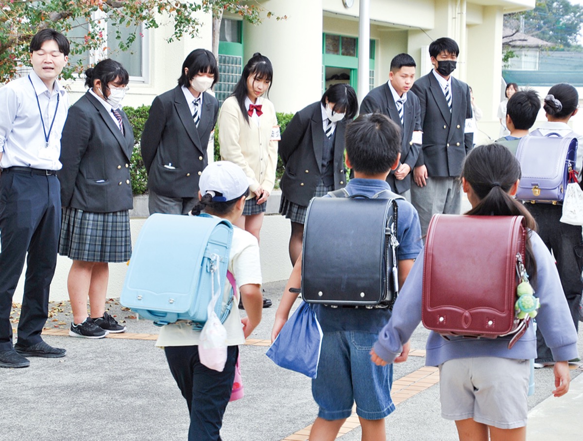 挨拶運動は午前8時から開始され、続々と登校する児童に6人は「おはようございます」と声掛け。それに応えて、元気に返事をする児童が見られた。約20分の挨拶を終え、生徒会長の工藤彩乃さん(高2)は「元気よく挨拶してくれてかわいかった」と話していた。