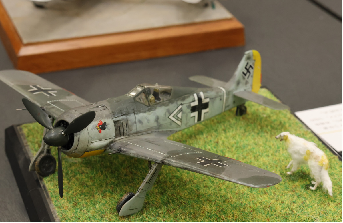 • 石坂会長の作品「フォッケウルフ Fw190 A-3」。愛犬「イオ」も一緒に