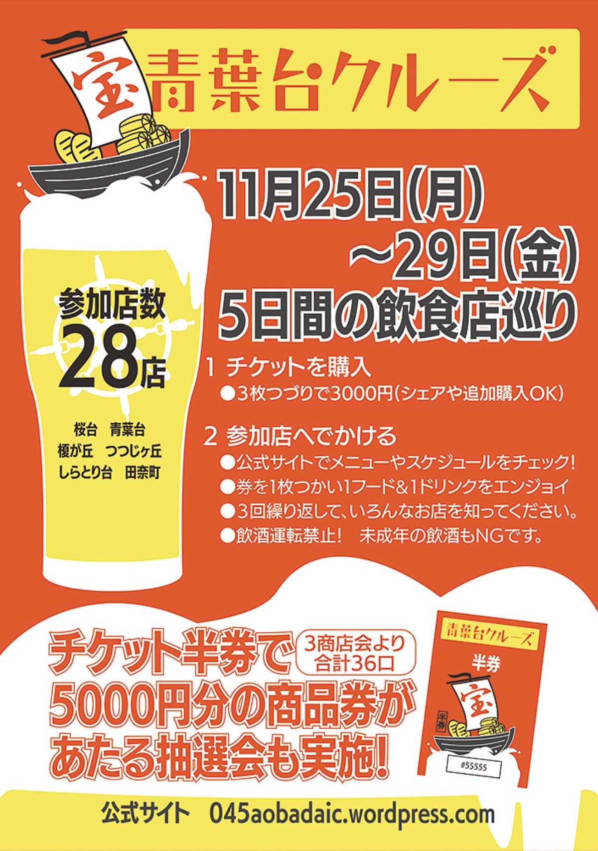 3枚綴り3000円のチケットを購入し、28の参加店から任意の店を選んで、それぞれの店で1フード1ドリンクを楽しむことができる。さらにチケット番号から36人に総額18万円分の商品券があたる抽選会も12月8日(日)に実施される。