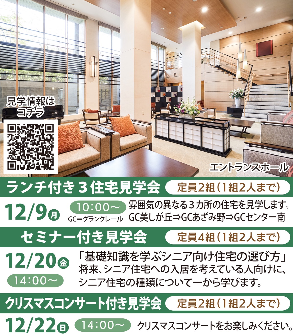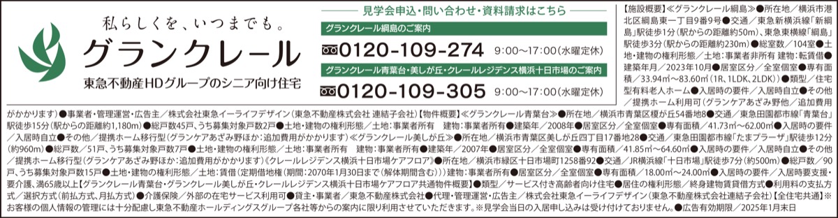 東急不動産HDグループが住宅づくりで培ったノウハウとグループ力を結集したシニアのための住まい「グランクレール」シリーズ。神奈川と東京で24住宅を展開し、すべて24時間365日の有人管理。体調の異変はもちろん、防犯面や防災面で安心できる環境を提供している。また、元気な時には「シニア住宅」に入居し、介護が必要になった際は「介護住宅」へと住み替えできるのも大きな特徴。元気な時も、見守りや介護が必要になった時も、その人らしさを支えている。今回は北部エリアのグランクレールシリーズを紹介。この機会に見学会に参加してみては。