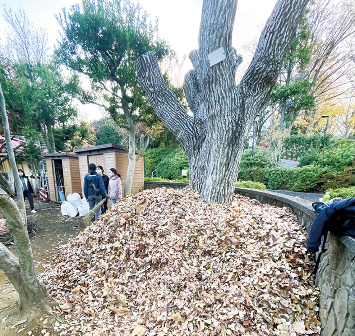 同団地のシンボルだったコナラの大木(枯れたため上部伐採済)の根元でバイオネスト作りも実施。バイオネストとは、落ち葉や枝などを鳥の巣のような形に積み上げた堆肥置き場。自然分解を利用したサステナブルな堆肥作りで、生物多様性の向上にもつながる。