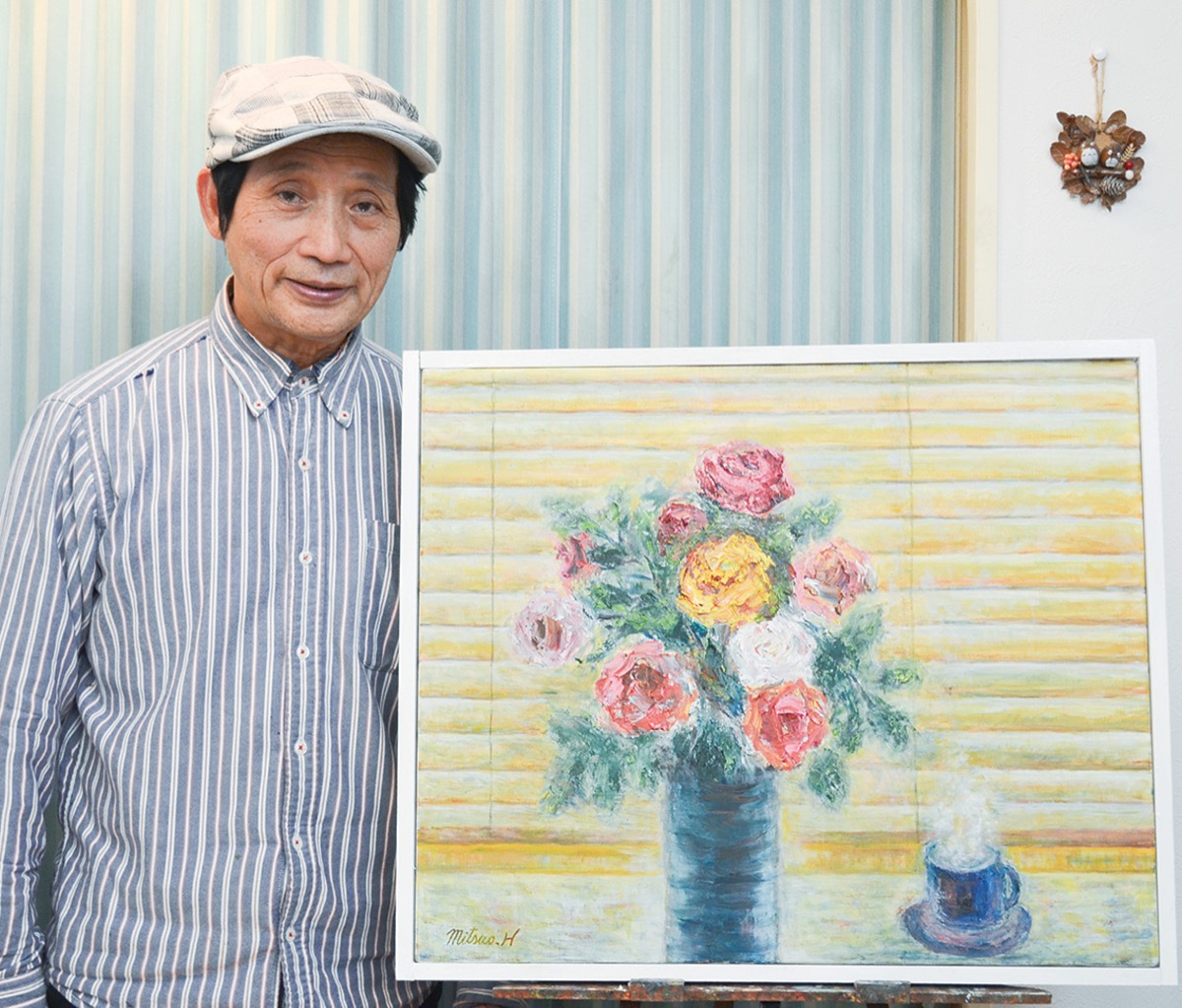 昨年描いた「モーニングコーヒー」は忙しい朝、一杯のコーヒーで一息つくひとときを表現。朝日が漏れるブラインドの向こう、行き交う人々の人生に思いを馳せて描いた。「(昨年は)誰もが光を見出せなかった。新たな年は明るく希望を持てるよう、私もお客様に幸せや明るさを届けていく」と早川オーナー。