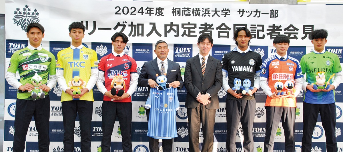 桐蔭横浜大学(森朋子学長)のサッカー部から今年度は7人の選手がJリーグクラブに内定し、12月23日に合同記者会見が行われた=写真。